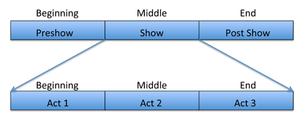 By considering the preshow as the beginning of the story process and the post show as the end, a storyteller can encompass a broader story than his initial three act structure will allow. This gives him the ability to warm the audience up to his story and to help them remember it long after they’ve seen it.